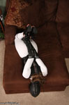 I am trussed up tight as can be in a strict hogtie that had my arms virtually welded together behind my back and my ankles drawn tight as could be unable to speak once the weight pulling up on the head harness drove the gag deep into my mouth and nearly half of my body weight was suspended from the ceiling.